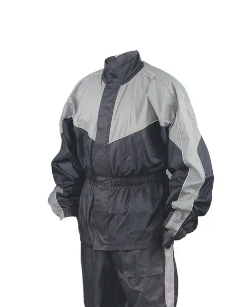 black and grey rain suit